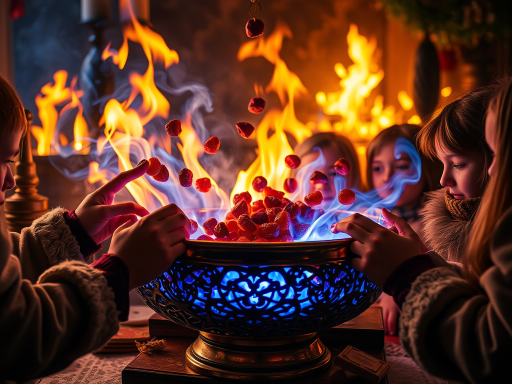 - Il Gioco: i partecipanti, a turno, dovevano afferrare con le dita un dolcetto dalle fiamme e, con un gesto rapido e deciso (lo “snap!”), gettarlo in bocca e spegnerlo (lo “snip!”).